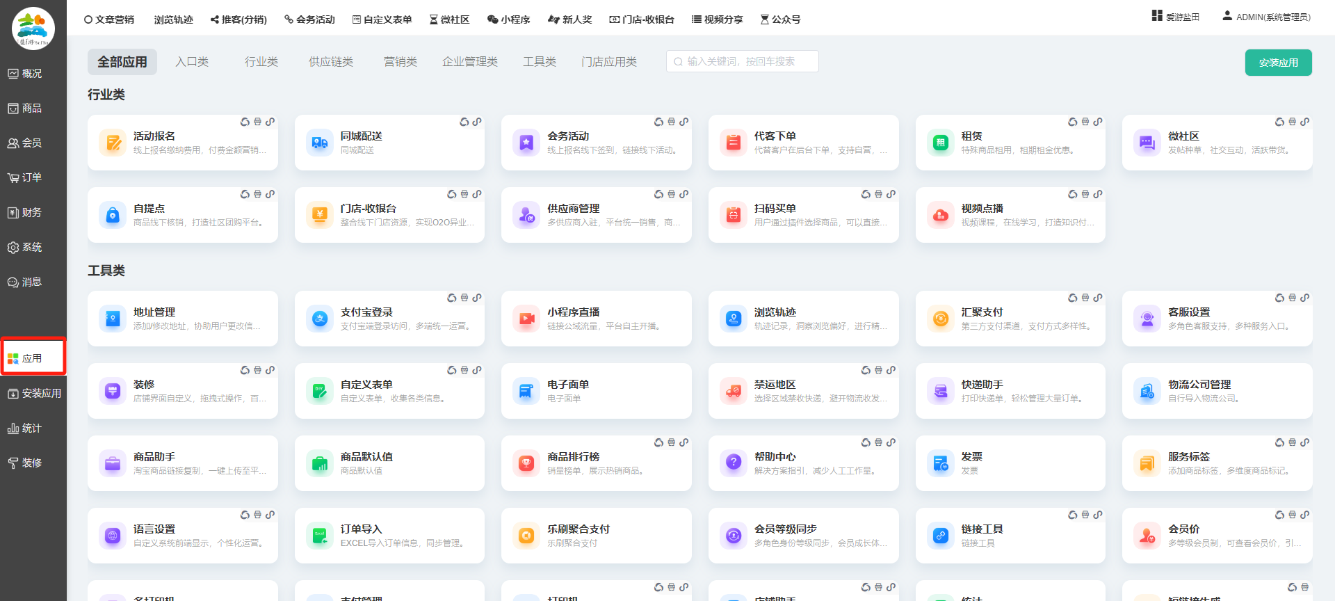 目录 搜索 展开 一、前期准备资料二、数字乡村码-上线操作指南1、服务号的申请流程及认证2、申请小程序流程3、开放平台绑定小程序和公众号三、数字乡村码-系统操作数字乡村码系统管理-概况数字乡村码-商品管理1、发布商品2、商品列表3、商品表单4、商品分类5、品牌管理6、配送模板7、评论管理8、优惠券管理9、商品标签10、退货地址设置11、满额优惠12、批量操作13、配送方式14、基础设置15、商品隐藏四、数字乡村码-会员管理1、全部会员2、会员等级3、会员分组4、资格申请5、会员设置6、推广中心设置7、会员邀请码8、会员关系链修改关系链修改记录9、会员合并记录10、账号注销管理11、会员设置中心五、数字乡村码-订单管理1、订单管理列表2、订单处理流程3、订单状态4、订单修改价格5、订单退款退货6、多包裹发货7、批量发货订单操作步骤8、催发货订单9、物流查询六、数字乡村码-财务管理1、余额设置2、会员余额3、充值记录4、转让记录5、余额明细6、收入明细7、提现设置8、提现统计9、积分管理10、转账审核11、收益广告12、批量充值七、数字乡村码-系统管理1、商城入口2、商城设置①、商城设置②、订单设置③、物流查询④、短信⑤、联系方式⑥、分类⑦、优惠券⑧、分享⑨、幻灯片⑩、广告位⑫、地图设置3、交易设置4、微信模板消息自定义消息模板(新版)自定义消息模板(旧版)小程序消息模板公众号模板消息变更公告5、语言设置6、权限管理7、多媒体管理八、数字乡村码-消息管理九、数字乡村码-应用管理十、数字乡村码系统-数据统计十一、数字乡村码-页面装修DIY1、模板管理2、店铺页面3、顶部导航4、底部导航5、DIY模板市场6、首屏广告7、基础设置8、装修DIY尺寸建议十二、供应商功能插件操作指南1、供应商2、门店-收银台门店申请和使用步骤门店管理①、门店-收银台 营销设置②、门店-收银台 分润设置门店分类门店申请门店审核门店商品门店商品订单收银台订单数据统计核销员基础设置默认设置门店装修3、微社区4、会务活动十三、营销插件操作指南活动报名提货卡新人奖微店问卷调查积分视频分享1、视频分享基础设置2、视频分享发现管理3、视频分享分类管理4、视频分享评论管理5、视频分享分红记录6、视频分享短视频中心每日红包幸运大抽奖签到优惠券二维码任务奖励优惠劵文章音频文章付费文章限时购新海报拓客卡操作流程积分活动素材中心视频红包十四、入驻门店应用类1、门店预约2、附近商品3、门店定位设置4、门店控制5、门店满额包邮6、门店满额减7、导入商品8、门店搜索9、门店股东10、核销券11、多门店核销1、商城后台设置2、前端功能演示十五、常见问题1、后台登录密码修改流程2、会员-余额,积分,后台如何进行充值与扣除3、如何修改上下级关系4、一种万能的获取商城小程序路径的方法 暂无相关搜索结果! 阅读次数:1761 本文档使用 模王系统 发布 九、数字乡村码-应用管理 九、商城管理-应用显示所有商城已安装并启用的应用,包含以下大类:具体根据自家商城后台系统显示为准。每个应用功能设置步骤较多,请查看相对应应用的学习文档。文档更新时间: 2024-01-08 10:36 作者:链上旅行
